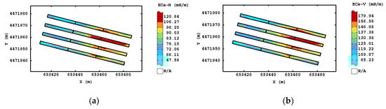 Figure 4 shows the ECa-H and ECa-V maps, which were quite similar. Consequently, we found homogeneity between horizons (shallow and deep), although the correlation was partly due to deep ECa integrating the 1.5 m soil that includes the 0.75 m soil layer (represented by ECa-H) [37].