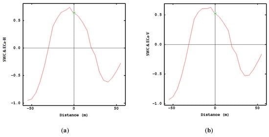 Cross correlogram between SWC and ECa in (a) horizontal polarization and ECa in (b) vertical polarization. Correlation coefficients at lag 0 are significant at a 0.05 probability level.