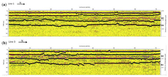 On all radar sections, four reflection events, almost flat and continuous and sometimes interrupted, were easily identifiable. These events could be interpreted as due to the soil interfaces, considering their wide amplitude and denoting a strong electromagnetic contrast. In Figure 6, the following four main layers can be recognized: a first layer (R1) between about 0.1 and 7 ns (about 0–0.36 m), a second layer (R2) between about 7.2 and 20.5 ns (about 0.3–1 m), a third layer (R3) between about 13.4 and 26 ns (about 0.67–1.3 m) and a fourth one (R4) between about 25.4 and 36 ns (about 1.2–1.8 m). These reflections were consistent with the depth of layers identified in pre-existing pedological profile (Table 1). Under the last layer, there was high attenuation, which could be indicative of groundwater or an area holding moisture (wetting front), as shown in a previous study [24].