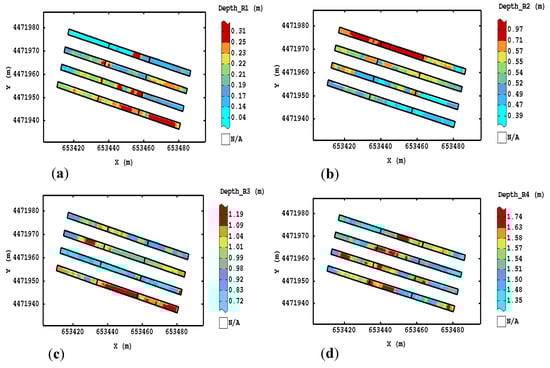 The cokriged maps (Figure 7) showed that the depth of the discontinuities varied along the profiles, therefore, the soil samples belonged to different soil layers. The first two maps (Figure 7a,b) represented the depths involved directly in the sampling and they show a difference between the first two soil strips and the last two ones. The third reflection shows the depth of the layer as a horizon with a lower permeability to water (Figure 7c). This layer was not directly involved in the sampling, but its presence and depth influenced the geophysical measurements that investigated a large volume of soil compared to soil samples. The fourth map represented the depth of the fourth reflection (R4, between 1.35 and 1.74 m), which corresponded to the effective depth range of ECa obtained in vertical polarizations (Figure 7d).