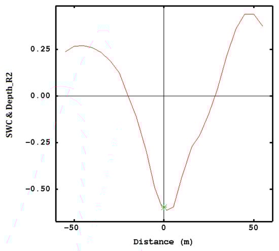 Figure 8 shows the correlation between SWC and the depth of R2, because it represents the beginning of the layer interpreted as horizon with lower permeability and which, therefore, could influence the vertical flux of water. The correlation was negative with the maximum correlation equal to –0.5 and the cross-correlograms showed enough symmetry around the lag zero.
