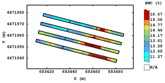 The cokriged map showed the same division of the field observed in the EMI and elevation maps with negative correlations, suggesting that EMI measurement can be affected by the soil profile, also confirming that ECa values are integrated values on all profiles. The correlation between SWC and the different depth was negative, and this result was likely due to the water content stored in areas with shallower layer. The low permeability was also larger than the total water content stored in the area with this deeper layer, as a consequence of the absence of water leaching. Therefore, the variations in soil discontinuity could significantly affect the spatial distribution of SWC [53].