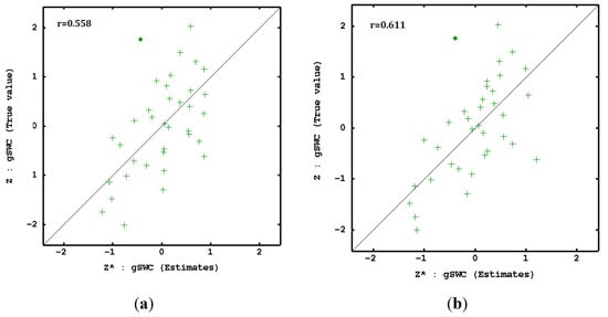 Scatter diagram of the measured SWC data versus the estimated values by (a) OK and (b) multi-collocated cokriging (MCCOK) through cross-validation.