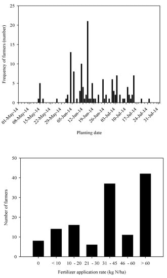Studies by [13] indicated that crop yields in sub-Saharan Africa may decline by 10% by 2055, and this impact is expected to vary over the region [14]. Most climate change impact assessments are done at large scales using crop management information that is usually generic. In [1], the authors projected reductions in cereal yields as a result of 1.5 and 2.0 °C increases in temperature in their assessment of climate change and variability on cereals in West Africa. Similarly, [15] analyzed the climate change impact on maize cropping systems in sub-Saharan Africa and indicated that the extent of impact varied between regions and input levels used. Most of these studies were, however, conducted at coarse scales, which do not capture the particular details at the farm-level. Though there are also other studies on climate change impact assessment conducted at the field scale that capture agro-ecological and soil type differences [16], other important determinants of production, such as variations of planting dates and fertilizer management practices have not been considered. In northern Ghana, for example, planting dates stretch over 3 months, with early planting beginning in May, normal planting in June and late planting in July. With regard to fertilizer use, N application ranges from zero to 60 kg N/ha (Figure 1). This suggests that climate change impact may differ for different categories of farmers.