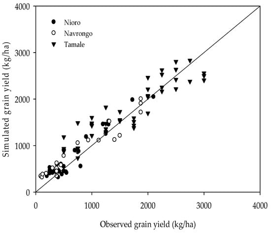 Grain yield was reasonably simulated with a RMSE of 183 kg/ha, RRMSE of 28%, NSE of 0.84 and Willmott’s d-index of 0.96 for Nioro (Table 6; see also Figure 2). On the other hand, a RMSE of 193 kg/ha, RRMSE of 23%, NSE of 0.89 and Willmott’s d-index of 0.97 were obtained for the Navrongo site using the 2012 survey information. For the Tamale site, RMSE, RRMSE, NSE and Willmott’s d-index were 324 kg/ha, 20%, 0.81 and 0.94 respectively based on the 2014 survey year.