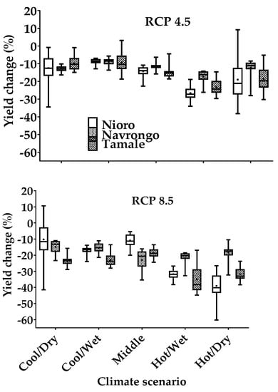 Variability in the impacts of climate scenarios on yields among farms at Nioro, Navrongo and Tamale sites under RCP 4.5 and RCP 8.5.