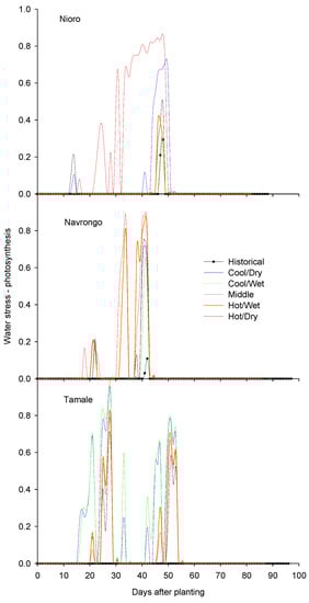 Simulated water stress on photosynthesis under historical climate and climate change scenarios at Nioro, Senegal, Navrongo and Tamale in Ghana. Water stress factor ranges from 1 (fully stressed) to 0 (no stress).