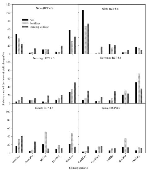 Analysis of variance revealed that the sole effects of fertilizer, planting window and soil type significantly impacted the variability in climate change impact on grain yield among farms under all climate scenarios at Nioro and Navrongo, but for Tamale, these factors were only significant under a few climate scenarios. Additionally, there were significant interactions for soil × fertilizer, soil × planting window and fertilizer × planting window at Nioro du Rip and Navrongo, while at Tamale, there were no significant interactions among these factors. The factor contributing most to the dispersion in the impact of climate scenarios was not consistent across sites. In Nioro, soil type contributed most to the relative standard deviation in climate change impact under the Hot/Dry scenarios under RCP 4.5 and under the Cool/Dry scenario under RCP 8.5. In the case of Navrongo and Tamale, the planting window contributed most to the RSD in climate change impact among farms under most of the climate scenarios. The magnitude of the RSD of the management factors were generally higher in Nioro than the other two sites. The extent to which these factors influenced grain yield change under climate change varied among the climate scenarios and also across sites. While the Hot/Wet climate scenarios under both RCPs produced the highest RSD among farms in Nioro, the trend was different for the other two sites.