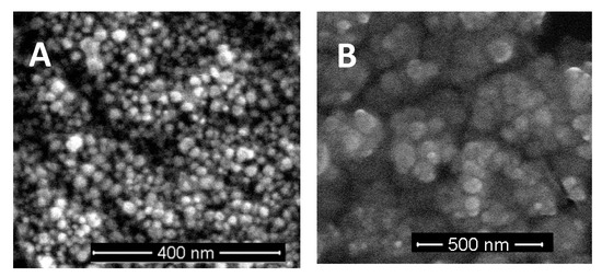 The size of nanoparticles in the nanocolloid solutions used for the study was measured with the use of scanning electron microscopy (Figure 1). The estimated sizes were 13.3 ± 3.6 and 38.3 ± 10.9 nm for AgNC (Figure 1A) and CuNC (Figure 1B), respectively. To ensure a high level of dispersion of the analyzed nanoparticles, the colloid samples were treated with ultrasound prior to the measurement. In the case of silver nanoparticles, the visualization showed nanoparticles with a clear granular structure, without visible areas containing nanoparticle agglomerates. Despite using similar methods, in the case of copper nanoparticles, complete deagglomeration of the sample was not achieved. The same suggests that the nanoparticle size obtained in the SEM experiment may have been somewhat overestimated due to charges and coating on particle surfaces [30].