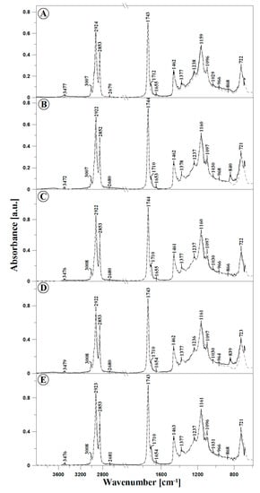 Exemplary ATR-FTIR spectra of the studied rapeseed oil samples from 2016 (gray broken line) and 2017 (black solid line): (A) control; (B) (O) AgNC; (C) (O) CuNC; (D) (N/O) AgNC; and (E) (N/O) CuNC. The spectra are presented in the spectral range of 590–4000 cm−1. Spectra are normalized at the intensity of a peak at 1743 cm−1.