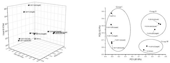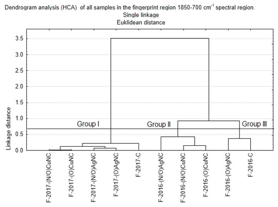 The similarity analysis of the IR spectra of the 10 oils samples is provided in Table 5. As shown in Table 5 (visualization in Figure 4), the FTIR spectra of oils from 2017 with different nanometals showed over 0.98 similarity, which indicated that the oils in these samples were generally similar. This confirmed the results obtained in the HCA. However, the similarity values for oils from 2017 and 2016 samples were very low. Samples F-2017-(O) CuNC and F-2017-(N/O) CuNC had the lowest absolute similarity value (0.07). These results indicate that significant differences in samples compositions existed between the respective years.