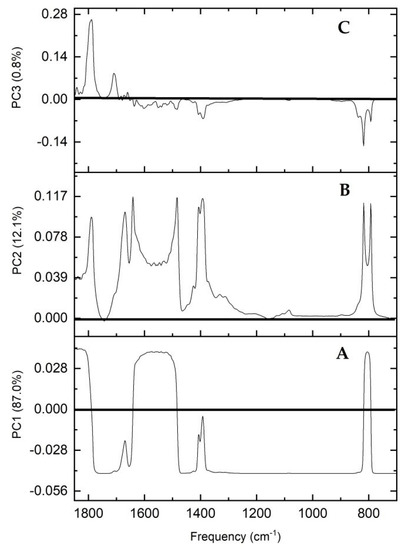 To more precisely discriminate the relationship between the investigated objects, the 1850–700 cm−1 band was selected as the fingerprint characteristic spectra and PCA was chosen at the main method of analysis [31]. As shown in Figure 5, a three-dimensional scatter plot with the principal components PC1, PC2 and PC3 was obtained from the FTIR spectra of different oil samples after PCA. To receive more information about the essential differences of oil compounds using the PCA model, loading factors were abstracted, and the loading factors atlas was drawn at a range of wave numbers between 1850 cm−1 and 700 cm−1 (Figure 6). PC1, PC2 and PC3 are main factors in the PCA model with a high contribution rate of PC1 which amounts to 87%. It means that PC1, PC2 and PC3 are sufficient for the illustration of the discrepancies in the composition of different oil samples. Peaks with the lowest contribution rate to PC1 included peak with maximum at c.a.–1400 cm−1 and 1670 cm−1 (Figure 6A). These peaks were closely related to the characteristic absorptions originated from methyl groups in aliphatic chains of the examined oils [32]. Peaks with the lowest contribution rate to PC2 included –1160 cm−1 (Figure 6B). This peak was strongly associated with vibrations of the methylene group. In this case, deformational vibrations in this group appear at the wavenumbers of 1160 cm−1 and 1158–1163 cm−1. Peaks with a larger contribution rate to PC3 include peaks corresponding to the lowest contribution to the rate of PC1 (Figure 6C). These results indicate that the differences between considered oils are mainly reflected in the different shape of the bands located between 1780 cm−1 and 1670 cm−1. This result agrees with that of the FTIR analysis. The use of FTIR combined with PCA can more objectively assess the quality of the investigated samples.