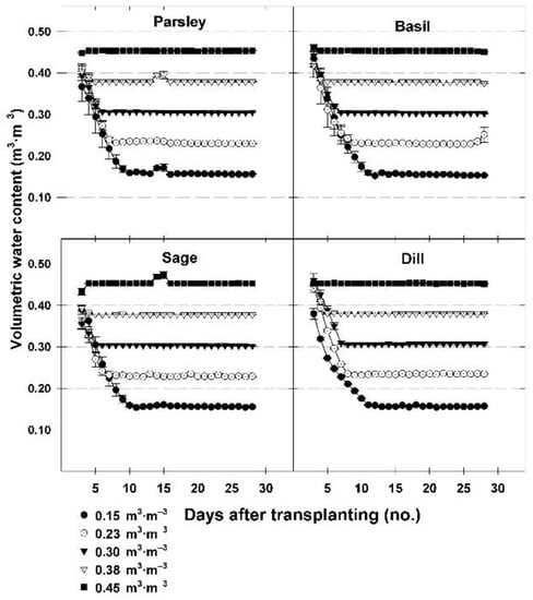 Reducing irrigation or substrate volumetric water content (VWC), commonly referred to as “deficit irrigation”, is another effective method of controlling containerized plant growth [6,7,8]. The water available for plant uptake increases and growth is promoted as substrate VWC increases and, as such, restricting irrigation and reducing the substrate VWC can diminish turgor pressure and subsequent stem extension and growth [9]. For example, containerized angelonia (Angelonia angustifolia Benth.) and petunia (Petunia × hybrid Vilm.) bedding plant growth is promoted by substrate VWC and, by reducing VWC, compact plants of marketable quality can be produced [7,10]. Additionally, using regulated deficit irrigation can suppress stem elongation of flowering potted plants, such as poinsettia (Euphorbia pulcherrima Willd. ex Klotzsch), providing adequate height control during production [11]. While controlling the substrate VWC clearly has potential for use in containerized herb production, data specific to the effects of substrate VWC on containerized herb growth are lacking.