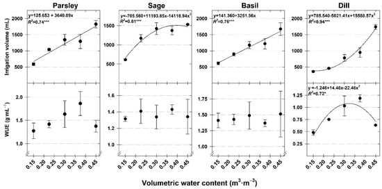 The experiment employed a randomized complete block design for each species. There were three blocks (replications) for each VWC for each species, with six individual plants per block. Data were analyzed using regression analyses (Sigma Plot 21.0; Systat Software, San Jose, CA, USA), with VWC concentration as the independent variable.