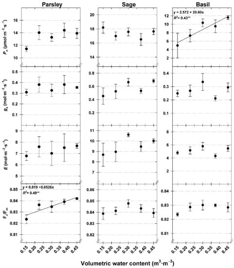 Although growth and development of herbs were greater at increasingly higher VWC, gas exchange was unaffected for parsley and sage (Figure 3). Under low water availability, gas exchange is reduced in most plants compared to higher availability [18]. For example, Pn and gs of Mediterranean herbs sea beet (Beta maritima) and wall-rocket (Diplotaxis ibicensis) decreased with increasing water deficit stress [19]. Similarly, gas exchange (Pn, gs, and E) of English lavender grown with sensor-based irrigation increased with VWC increasing from 0.10 to 0.40 m3·m−3 [9]. According to Yan et al. [20], annual herbs do not vary greatly in gas exchange with changing water status, suggesting limited response regulation, although the method of imposed stress may affect this. Montesano et al. [21] reported that, when irrigation was completely withheld for basil, the Pn, gs, and E decreased after three days. However, the authors also reported that, when VWC was controlled using sensor-based irrigation and maintained 0.20, 0.30, or 0.40 m3·m−3, fresh mass increased with increasing VWC, whereas Pn, gs, and E were unaffected by increasing VWC. In contrast, Pn in our study increased for basil as VWC increased from 0.15 to 0.45 m3·m−3; however, within 0.20 to 0.40 m3·m−3, Pn was similar to reports by Montesano et al. [21]. Taken together, our results align well with the literature for suppressed growth and development at lower VWC and for gas exchange under sensor-based irrigation for herbs. Drought stress reduced Fv/Fm in plants compared to well-watered conditions, which is in agreement with chlorophyll content for nontolerant species [22,23]. Nemali and van Iersel [14] reported that, as VWC increased, the quantum yield efficiency of photosynthesis increased for petunia, salvia, impatiens, and vinca, similar to parsley in this study, although basil and sage were unaffected, similar to previous reports by [9].