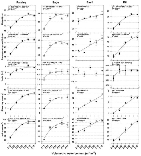 We have found some limited reports on the effects of substrate moisture on containerized perennial herb growth [8,9]. Zhen et al. [8] reported that limiting irrigation of rosemary (Rosmarinus officinalis L.) plants successfully controlled excessive growth. Additionally, Zhen and Burnett [9] showed that English lavender (Lavandula angustifolia Mill. ‘Hidcote’ and ‘Munstead’) growth diminished with decreasing substrate VWC. These data are promising for controlling containerized herb growth by limiting substrate VWC. However, we have found no other data on the use of drought stress to control excessive growth of more common containerized herb species grown with shorter production periods. Our objective was to quantify the effect of substrate VWC on the growth of four common culinary annual herbs grown in containers in the greenhouse. We hypothesized that the growth of parsley, sage, basil, and dill would be promoted by increasing substrate VWC and, as such, restricting irrigation would be an effective growth-control strategy for containerized culinary annual herb species with short growth cycles.