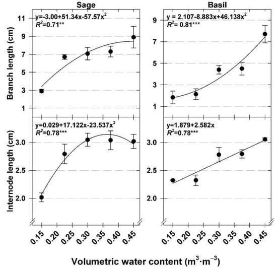 Branch and internode length of sage (Expt. 1) and basil (Expt. 2) grown in 11.4 cm diameter containers filled with a soilless substrate comprising (by vol.) 75% sphagnum peat moss and 25% coarse perlite amended with 3.0 kg·m−3 controlled-release fertilizer and maintained at 0.15, 0.23, 0.30, 0.38, or 0.45 m3∙m−3 substrate volumetric water content for four weeks. Regression lines are presented for significant correlations only with corresponding R2 presented. ** or *** indicates significant at p ≤ 0.01 or 0.001, respectively.
