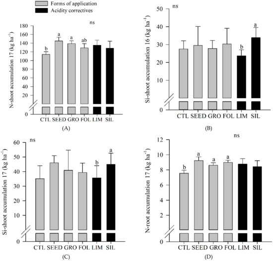 N shoot accumulation in 2017 (A), Si shoot accumulation in 2016 (B), Si shoot accumulation in 2017 (C), N root accumulation in 2017 (D), Si soil content in 2016 (E), and Si soil content in 2017 (F) as a function of forms of inoculation and acidity corrective sources. CTL, SEED, GRO, and FOL represent the control treatment, and the seed, groove, and foliar applications of A. brasilense, respectively. LIM and SIL represent limestone and silicate applications, respectively. The letters correspond to a significant difference at the 5% probability level (p ≤ 0.05). Error bars indicate the standard error of the mean (n = 4).