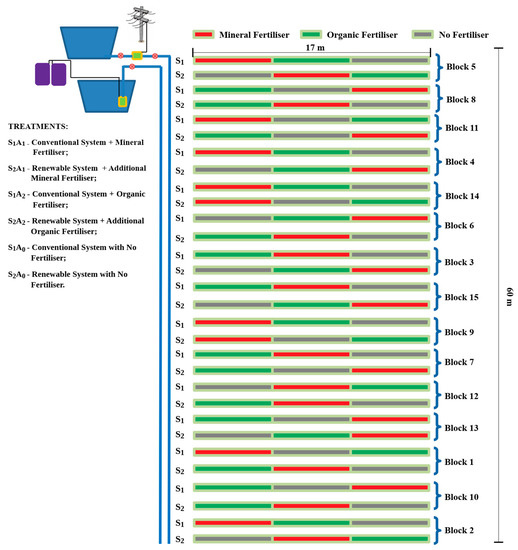 The experimental plot consisted of one row, 16.8 m in length, with 42 plants, at a spacing of 0.4 m between plants and 1.0 m between rows; this was subdivided into three subplots for the different sources of fertiliser. Each subplot had 14 plants and an area of 5.6 m2. The total experimental area was 504 m2 and the total working area, 216 m2, with only the central plants of each subplot being considered for data collection, where each subplot represented one replication. The treatments representing the six irrigated production systems with different sources of water, energy and fertiliser are shown in Figure 2.