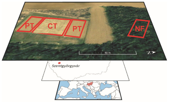 The Szentgyörgyvár research site was established in western Hungary (46°44′54.1″N, 17°08′48.4″E) in 2003 to compare ploughing tillage (PT) (on two 1200 m2 plots; cultivation based on fall moldboard plowing) and CT (on two 1200 m2 plots; reduced cultivation without inversion leaving at least 30% of the plant residues on the surface) at the field scale [30] (Figure 1). A NF next to the plots was also sampled as a control. Soil samples were taken from the uppermost soil layer (0–15 cm) of a haplic Luvisol (free of carbonates) formed on sandy loess. The steepness of the plots was 9% to 10%, thereby resulting in a uniform slope. Three composite samples were collected from each land use type, including subsamples from upslope, middle slope, and downslope. A detailed description of the soil properties and tillage operations in the cultivated sites plus the forest site characteristics was presented by Rieder et al. [18]. The climate is subhumid, with a mean annual temperature of 11 °C and precipitation of 628 mm.