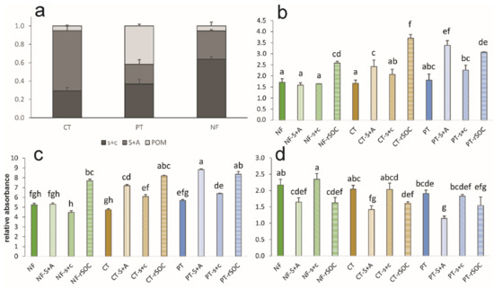 Total organic carbon distribution of the investigated Luvisol under various land uses (a). The aromaticity index (b), the relative absorbance at 1794 cm-1 referring to the oxidation degree (c), the clay/quartz index (d), and values of the fractions. Different letters above the bars indicate the significant difference at p < 0.05 (CT: conservation tillage; PT: ploughing tillage; NF: native forest; S+A: sand and aggregates; s+c: fine fraction (<20 µm); POM: particulate organic matter; rSOC: resistant part of organic carbon attached to s+c).