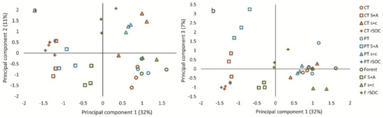 Data distribution along principal components 1 and 2 (a) and 1 and 3 (b). CT: conservation tillage; PT: ploughing tillage; NF: native forest; S+A: sand and aggregates; s+c: fine fraction (<20 µm); POM: particulate organic matter; rSOC: resistant part of organic carbon attached to s+c.