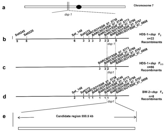 Mapping of the dsp1 locus. (a–d) Two F2 populations of HDS-1 × dsp (b) and BW-2 × dsp (d) were used here. One F2:3 population derived from Dsp1dsp1dsp2dsp2 F2 plants of HDS-1 × dsp cross was used to verify the mapping result of dsp1 (c). The dsp1 locus was mapped to a 550.5-kb region nearby centromere on chromosome 07 with BARCSOYSSR_07_0787 and BARCSOYSSR_07_0808 as flanking markers (e). Black spot represents centromere. Number below every SSR marker means recombinant individual number.