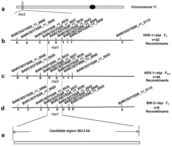 Mapping of the dsp2 locus. (a–d) Two F2 populations of HDS-1 × dsp (b) and BW-2 × dsp (d) were used here. One F2:3 population derived from dsp1dsp1Dsp2dsp2 F2 plants of HDS-1 × dsp was used to verify the mapping result of dsp2 (c). The dsp2 locus was mapped between BARCSOYSSR_11_0037 and BARCSOYSSR_11_0043, a 263.3-kb region in the front end of chromosome 11 (e). Black spot represents centromere. Number below every SSR marker means recombinant individual number.