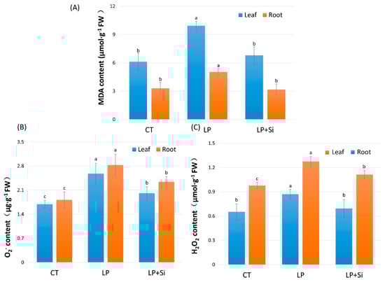 Effect of low phosphorus (LP) and silicon (Si) on lipid peroxidation and reactive oxygen species content in tomato plants: (A) Malondialdehyde (MDA) content, (B) O2−· content, and (C) H2O2 content in tomato leaves and roots. Data are shown as means ± standard deviation (SD) of three replicates. Bars with the same color but different letters indicate statistically significant differences at p ≤ 0.05. CT = normal phosphorus supply (P 0.66 mM); LP = low phosphorus supply (2/3rd of normal P); Si = 1.5 mM Si.