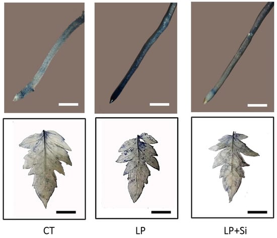 In situ superoxide (O2−·) accumulation in tomato roots and leaves as influenced by low phosphorus (LP) and exogenous silicon (Si): O2−· accumulation was visualized following nitroblue tetrazolium chloride (NBT) staining. NBT-stained roots (upper panels) and leaves (lower panels) show localized O2−· accumulation as dark-blue spots under different treatments. Scale bars = 2 mm (upper panels) and 2 cm (lower panels).