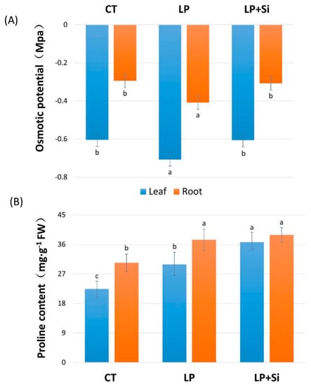 Effect of low phosphorus (LP) and silicon (Si) on osmotic potential and proline content in tomato plants: (A) Osmotic potential and (B) proline content in tomato leaves and roots. Data are shown as means ± standard deviation (SD) of three replicates. Bars with the same color but different letters indicate statistically significant differences at p ≤ 0.05.
