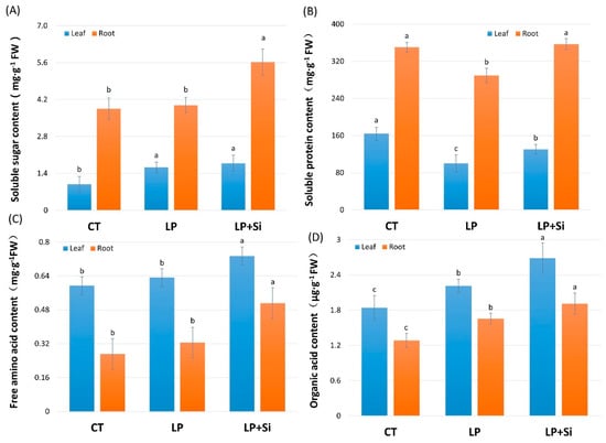 Changes in osmoregulatory substances as influenced by low phosphorus (LP) and exogenous silicon (Si) supply in tomato plants: (A) Soluble sugar content, (B) soluble protein content, (C) free amino acid content, and (D) organic acid content in tomato leaves and roots. Data are shown as means ± standard deviation (SD) of three replicates. Bars with the same color but different letters indicate statistically significant differences at p ≤ 0.05.