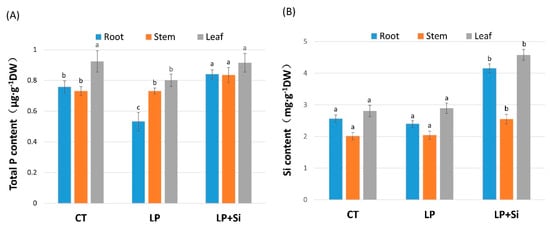 Accumulation of phosphorus and silicon in different tissues of tomato plants as influenced by low phosphorus (LP) and silicon (Si) supply: (A) Total P content and (B) Si content in tomato roots, stems, and leaves. Data are shown as means ± standard deviation (SD) of three replicates. Bars with the same color but different letters indicate statistically significant differences at p ≤ 0.05.