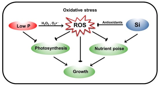A working model showing potential mechanisms of Si-induced alleviation of low P stress in tomato: Low P stress induces oxidative stress by triggering reactive oxygen species (ROS) accumulation, leading to impairment in photosynthesis and nutrient homeostasis. Suppression in photosynthesis and nutrient acquisition due to deficient P supply results in growth inhibition; however, exogenous Si application reduces ROS accumulation and subsequent oxidative stress by enhancing antioxidant potential. Moreover, Si improves photosynthesis and essential nutrient acquisition, which eventually stimulate plant growth and biomass accumulation.