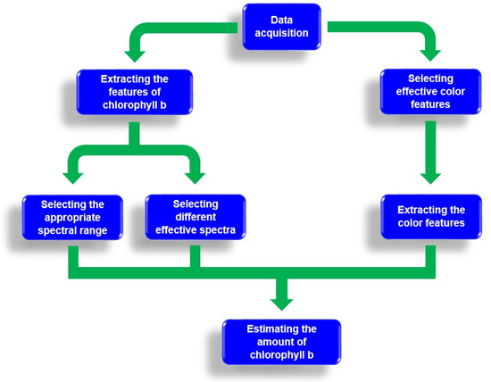 Flowchart of different stages of non-destructive estimation of chlorophyll b content using two color and spectral methods.