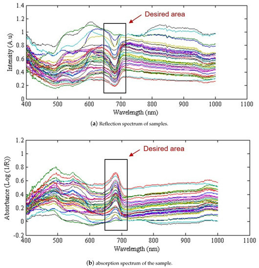 Figure 4 shows the response of red delicious apple to spectra in a range of 400 to 1000 nm, in both the reflection spectrum and absorption spectra of the samples. The absorption spectrum of the sample was obtained using the log (1/R) relation, in which R is a reflection spectrum. As shown in Figure 4 with the box, there is a peak between 680 and 700 nm, which is related to the absorption of chlorophyll [42,43].