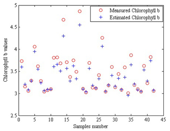 Each replicate contains 13 test samples, so there will be 13,000 samples in 1000 replicates, and since there are only 42 samples, there will be more than 309 replicates per sample, and their average is measured. As can be seen, the regression coefficient between the mean of predicted and measured values is more than 0.977, which indicates the high performance of the proposed method for the non-destructive estimation of chlorophyll b content. Figure 6 shows a graphical example for comparing the actual value of chlorophyll b content of apple samples with a mean estimated value of chlorophyll b using color data in 1000 replicates. As can be seen, in most samples, actual values and mean estimated values of chlorophyll b are superimposed, indicating an acceptable prediction of the method used.