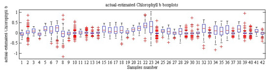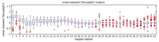 Figure 9 and Figure 10 illustrate the boxplots obtained by differentiating the actual amount of chlorophyll b and its estimated values using color and spectral data. Each replicate contains 13 test samples, so there will be 13,000 samples in 1000 replicates, and since there are only 42 samples, each sample will have more than 309 replicates. In a large number of these samples, box plots are compressed, which means that predictive methods have close results in different replicates, which indicates the reliability of the methods used. Finally, Table 7 and Table 8 show the actual value, mean, standard deviation, and predicted value of chlorophyll b content of 42 red delicious apples on the test data set using color and spectral data.