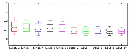 Box plot of hybrid neural network method-biogeography-based algorithm error assessment criteria for non-destructive estimation of chlorophyll b for 1000 repetition. The subscript numbers show the number of effective features.