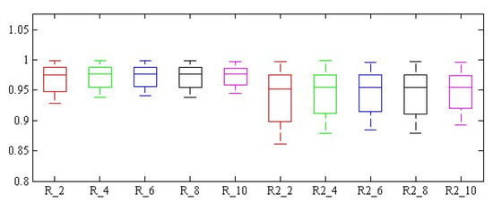 After selecting different groups of effective spectra, these spectra were sent as inputs to the hybrid ANN-BBO for estimating the amount of chlorophyll b properties. Table 10 shows the mean, standard deviation, and best results of evaluation parameters of performance of hybrid ANN-BBO on the data of selected effective wavelengths in 1000 replicates. As can be seen, the highest value of the coefficient of determination for the input set with the number of effective features is 10. Of course, there is little difference between the coefficients of determination in different categories of effective features. In the same way, Figure 11 and Figure 12 show the box plots of error assessment criteria, regression coefficients, and determination of the hybrid neural network-biogeography optimization algorithm method in non-destructive estimation of the amount of chlorophyll b for 1000 replicates.