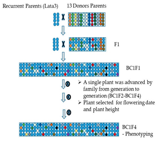 Thirteen biparental backcross populations were developed using the same recurrent parent “Lata” and 13 different donor parents (Table 1). The recurrent parent was derived from a random-mating Guinea Population [7] and identified through farmer-participatory variety testing [16,17]. Lata3 was chosen as the recurrent parent because of its importance. It is cultivated as a novel intermediate-height, pure-line variety and used as the male parent for successful hybrids even though it has weaknesses including suboptimal glume opening and susceptibility to Striga. The 13 donor parents were chosen to represent geographical and racial diversity from within the Guinea-race and other races (Table 1). They were also chosen to contribute traits that contribute to adaptation and farmer acceptance of new varieties including tolerance to biotic (Striga, sorghum midge) and abiotic (soil phosphorus deficiency, aluminum toxicity) stresses, quality (grain vitreousness, stem sweetness), and panicle desirability (laxness, glume opening).
