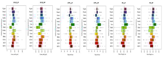Best linear unbiased estimates for grain yield, days to flag leaf, and plant height of progenies, presented as box plots with progenies of a common donor parent, where colored boxes correspond to 25% above and 25% below the median for that group, midlines of each boxplot represent the median, whiskers indicate the total range, circles denote outlier values, and the red- and green-dashed lines indicate the trail and the recurrent parent Lata3 mean yields, respectively, under LP and HP conditions in 2013.