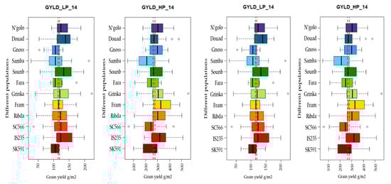 The progenies among the top 25% for yield in each population were generally all superior to the recurrent parent under both LP and HP conditions in 2013 (Figure 3) as well as in 2014 and 2015 (Figure 4). Only progenies in the top quartile of the population Hafid did not exceed the recurrent parent (Figure 3), with the top-quartile mean being numerically inferior under both LP and HP conditions (Table 7). Under LP conditions, two populations (Grinka and Soumb) had the highest mean for the top quartile progenies in 2013 as well as combined over 2014 and 2015, with a third population (SC566) ranked third and fifth, respectively (Table 7). The five top-ranking populations for top-quartile progenies means under HP were identical to those under LP in 2013, but in the multiyear evaluation, they included only two of the five populations (Soumb and N’golo) (Table 7).