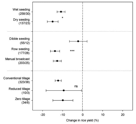 Influence of different crop establishment, seeding methods, and tillage practices on the yield change of direct-seeded rice relative to transplanted rice. The number of paired observations/number of studies included in each dataset are presented in parenthesis. Significant differences by categories are based on randomization tests; ns denotes non-significance at 0.05, * denotes significant at p ≤ 0.05, ** denotes significant at p ≤ 0.01, and *** denotes significant at p ≤ 0.001.