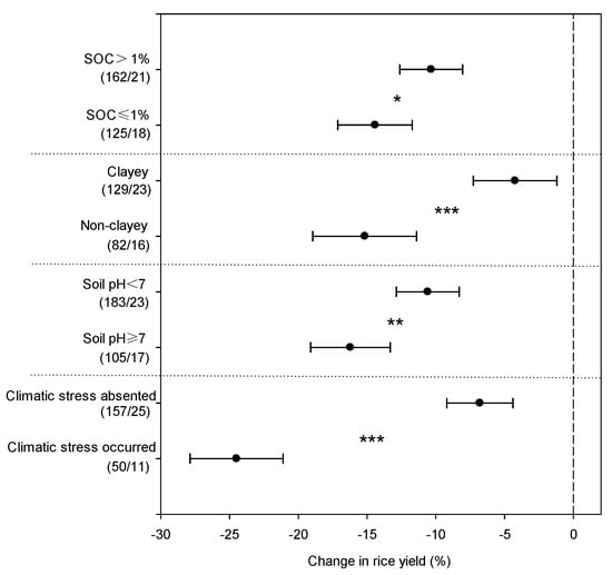Influence of different soil organic carbon content (SOC), soil texture, soil pH, and climatic stress occurrence on the yield change of direct-seeded rice relative to transplanted rice. The number of paired observations/number of studies included in each dataset is presented in parenthesis. Significant differences by categories are based on randomization tests. ns denotes non-significance at 0.05, * denotes significant at p ≤ 0.05, ** denotes significant at p ≤ 0.01, and *** denotes significant at p ≤ 0.001.