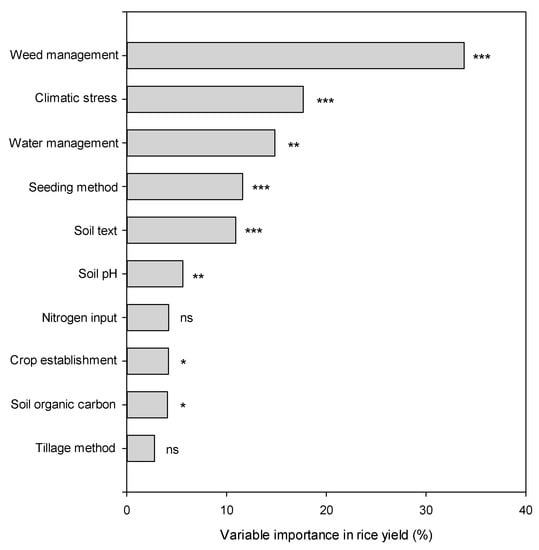 Relative variable importance ranking for the yield impacts of direct-seeded rice relative to transplanted rice. Significant differences by categories are based on randomization tests. ns denotes non-significance at 0.05, * denotes significant at p ≤ 0.05, ** denotes significant at p ≤ 0.01, and *** denotes significant at p ≤ 0.001.