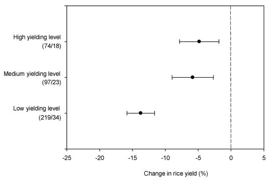 Percentage changes in direct-seeded rice yield relative to transplanted rice for different yielding levels. The number of paired observations/number of studies included in each dataset are presented in parenthesis. Significant differences by categories are based on randomization tests.