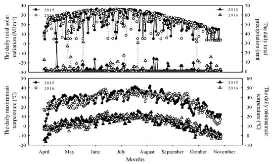 The daily total solar radiation (MJ m−2), total precipitation (mm), maximum and minimum air temperature (°C) during cotton growing season in Shihezi (2015–2016).