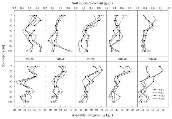 Changes in the soil moisture and the available nitrogen in different vertical soil layer (from 0 to 120 cm soil layer) at pre-sowing irrigation (W80) or no pre-sowing irrigation (W0) and base fertilizer surface (F10) or deep (F30) application with the days after emergence in 2016. Bars indicate SD (n = 3).