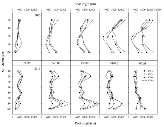Cotton plant root length was significantly affected by irrigation levels and fertilization during the whole growth period. Root length gradually increased with the plant development but decreased later in the season (Figure 3). W80 treatment increased root length by 3.1–17.5% in the 0–40 cm soil layer but decreased by 7.7–66.1% in the 40–120 cm soil layer after 54 DAE than W0 treatment. W80 F10 treatment had 3.5%–29.5% higher root length in the 0–40 cm soil layer, but 1.2%–10.5% lowered root length was observed in the 40–120 cm soil layer after 54 DAE compared with W0 F30.